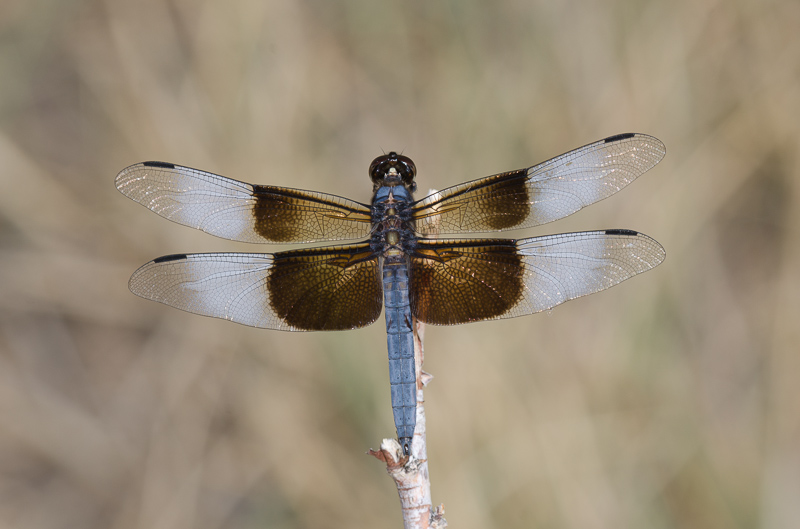 Dragonflies typically rest with their wings spread, and have a clearly noticeable difference in size between their forewings and hindwings. Widow skimmer, photographed by Bryan E. Reynolds.
