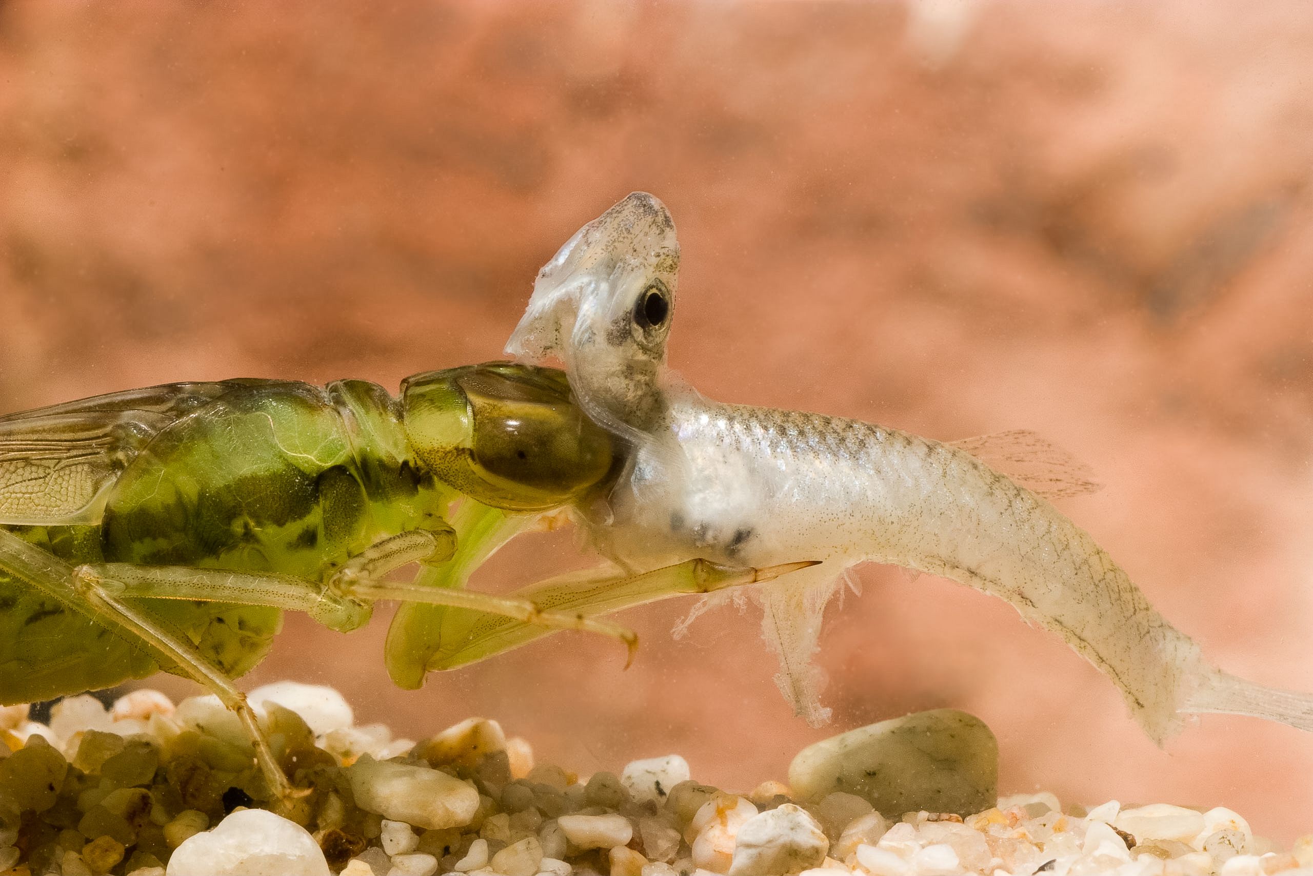 Nymphs appear very different from the adult form, but share the predaceous behavior. Nymphs of all species have a remarkable “prehensile” lip that extends to capture prey. Using internal hydrostatic pressure, a nymph can shoot out the labium rather quickly, fast enough to secure such prey as other insects, worms, and even small fish.
