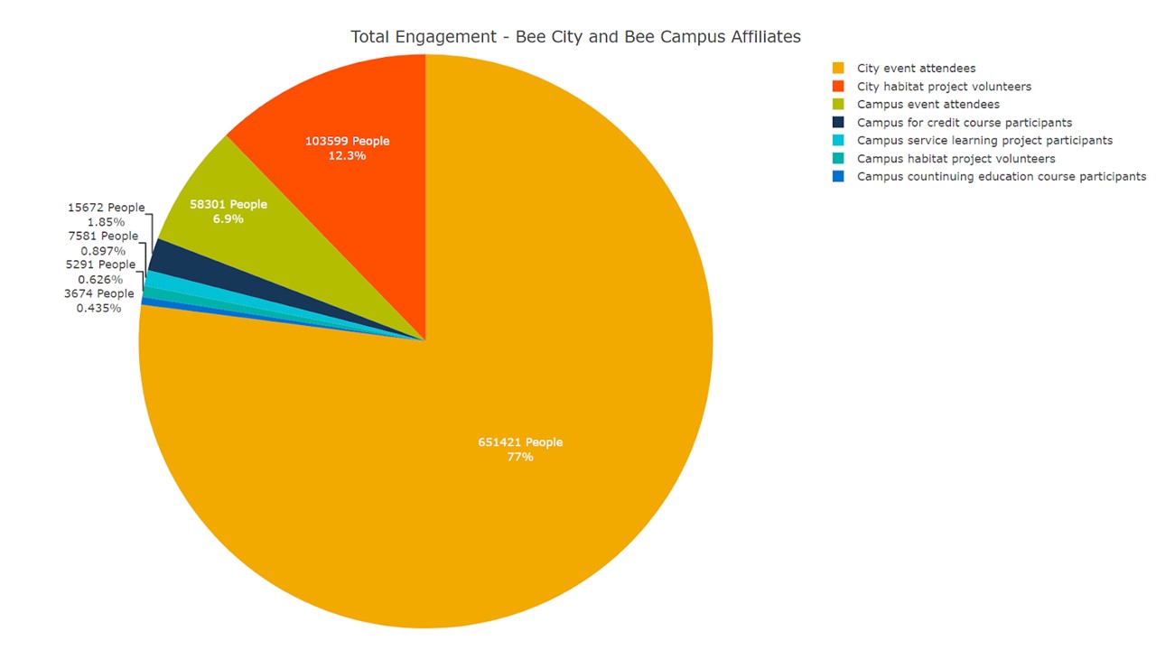 - A total of 829,867 people were engaged in pollinator conservation in 2019 as a result of Bee City USA and Bee Campus USA affiliates. This included individuals who attended events, habitat project volunteers, participants in for-credit and continuing education courses, and those involved in service-learning projects.