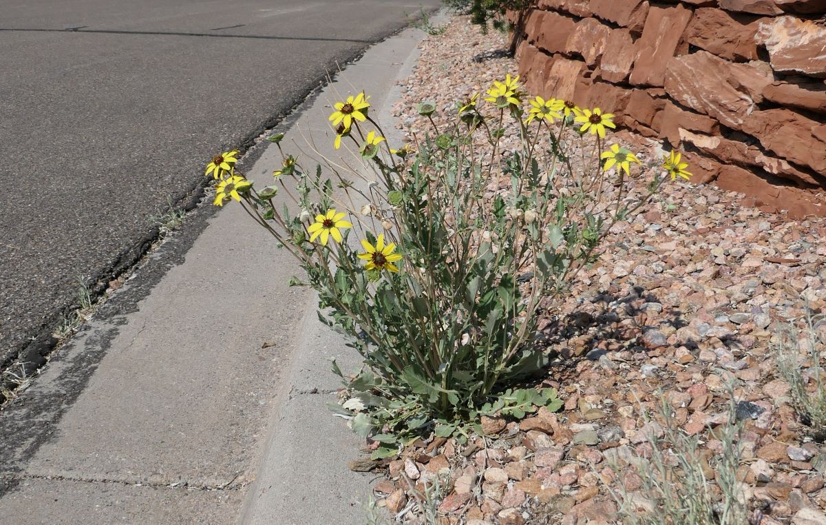 Native plants of the desert are tough! This volunteer chocolate flower (Berlandiera lyrata) thrives in this hot location between rocks and a hard place, demonstrating the climate extremes this native species can tolerate. (Photo: Kaitlin Haase / Xerces Society)
