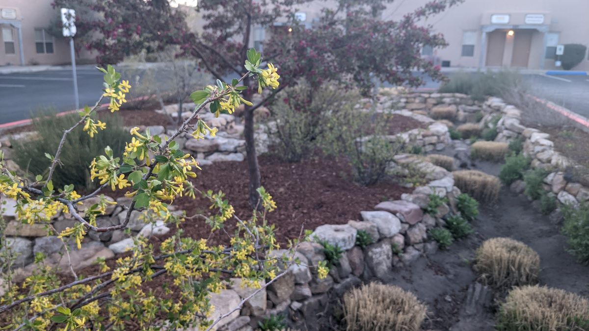 Golden current (Ribes aureum) blooms in a Santa Fe rain garden. Rainwater runoff from the surrounding parking lot drains into this garden, increasing water infiltration and sustaining pollinator plants. (Photo: Kaitlin Haase / Xerces Society)