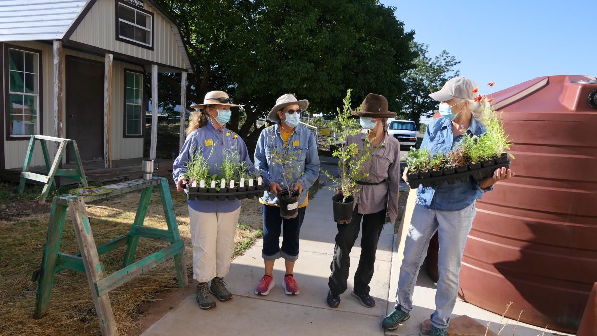 Santa Fe Extension Master Gardeners and the habitat kits they are about to put in the ground at the Santa Fe County Extension Office Demonstration Gardens. The eighteen species in the kits are native, climate-resilient species which will support a diversity of native pollinators across seasons. (Photo: Kaitlin Haase / Xerces Society)