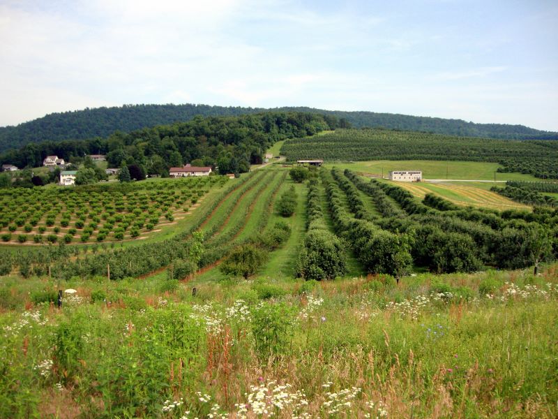 Pollinator habitat surrounds and orchard in Pennsylvania, integrating natural and agricultural landscapes (Photo: Kelly Gill/ Xerces Society).