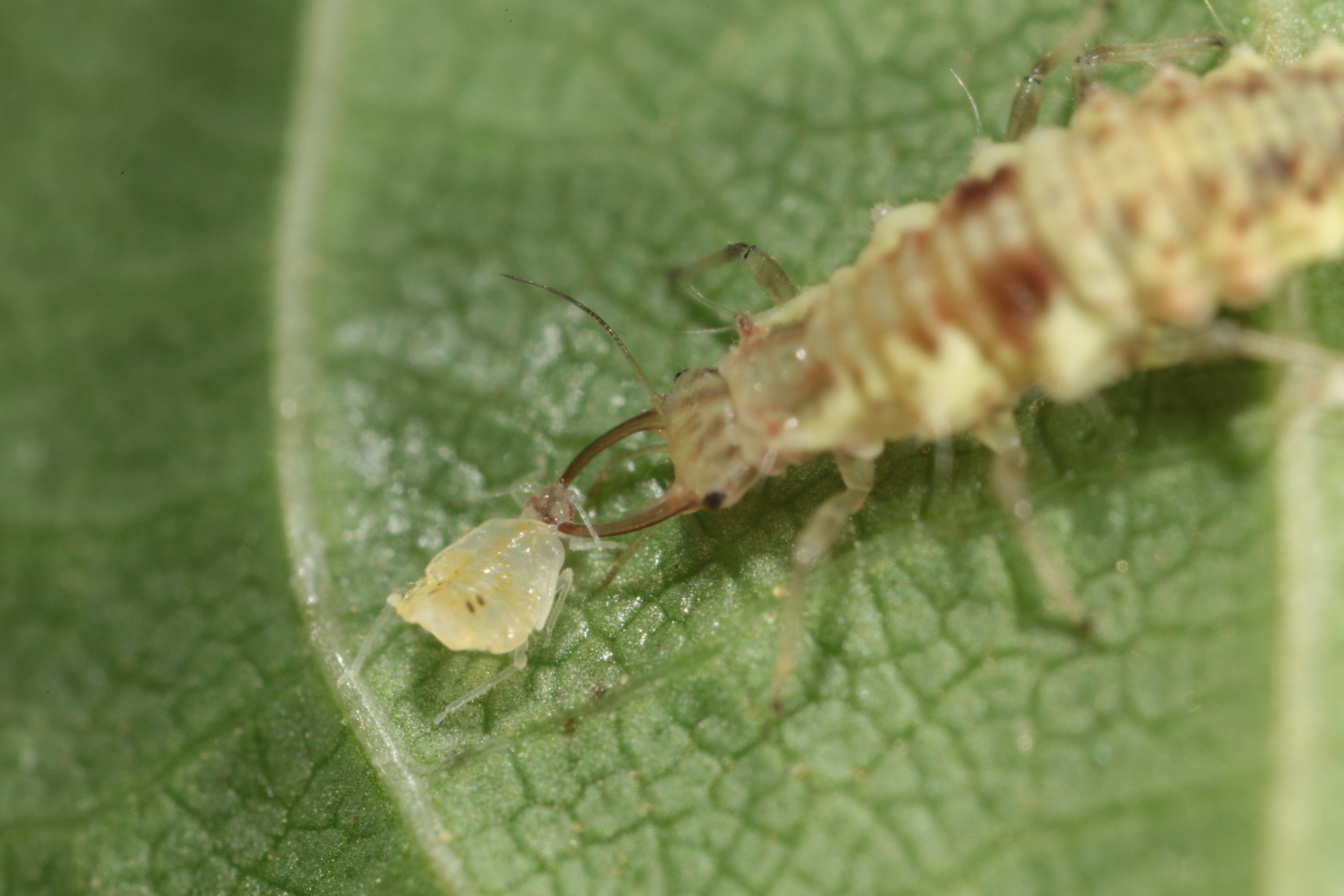 Mosquito sprays can harm beneficial insects, like this green lacewing larva busy eating an aphid. Contaminated flowers can still be toxic the next day for foraging bees, and butterfly larvae can be exposed even if spray happens early or late in the day. (Photo: Kevi Mace-Hill.)