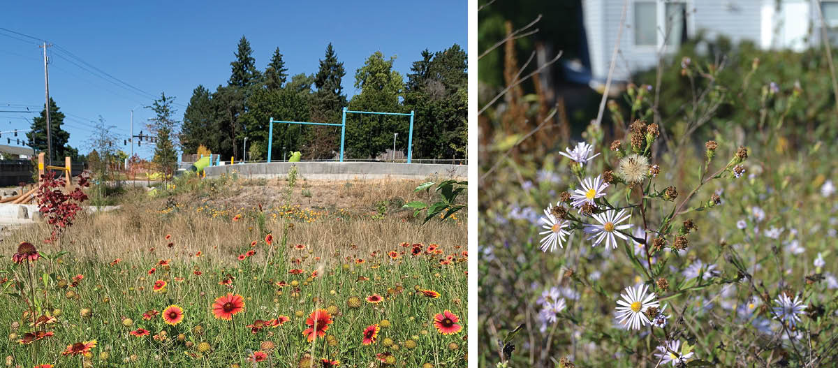 (Left) The recent remodeling of this park integrated a daylighted creek and a flowering meadow with a rebuilt playground to create an easily accessible are that invites nature exploration. (Right) Nature awaits just over the back fence in this suburban neighborhood. Walking trails connect the community with playgrounds and other recreation options and habitat offers shelter to a diversity of wildlife. (Photo: Matthew Shepherd)