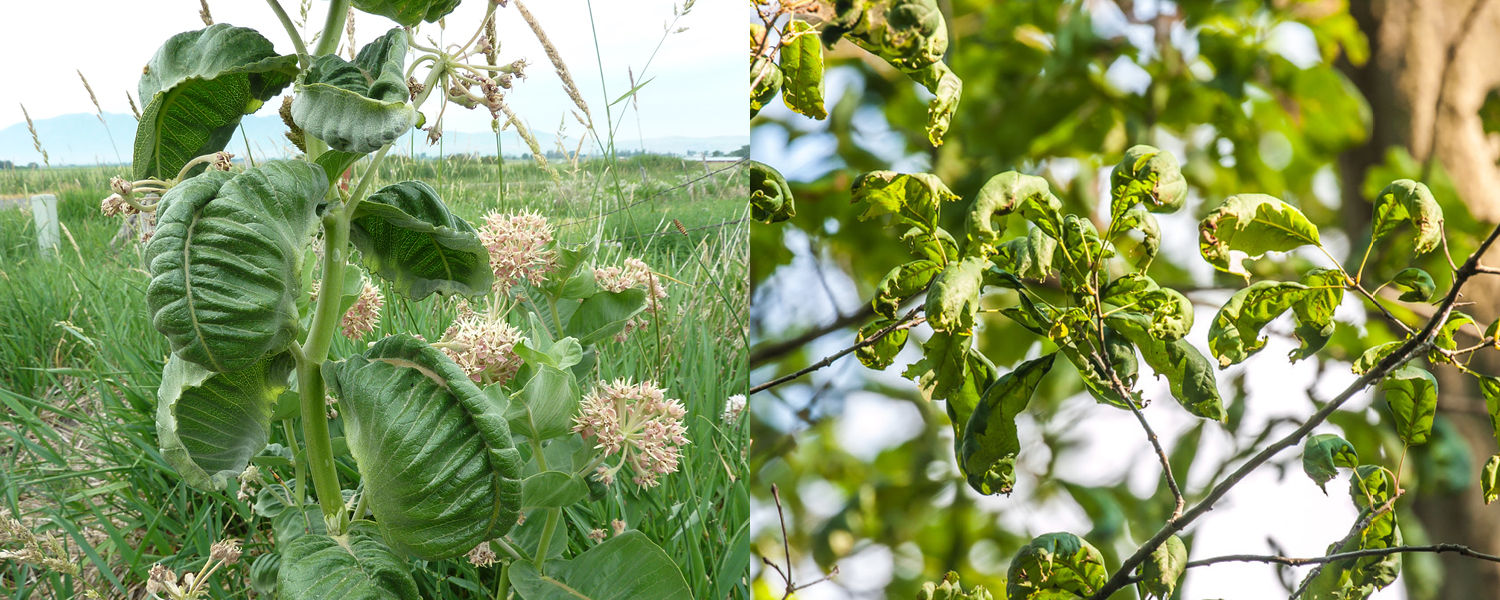 A distinctive symptom of dicamba contamination is leaf curl, which affects plants small and large. On left is a showy milkweed (Asclepias speciosa), on right a red oak (Quercus rubra), both displaying the impact of dicamba drift. (Photos: left, Xerces Society / Brianna Borders; right, Prairie Rivers Network.)