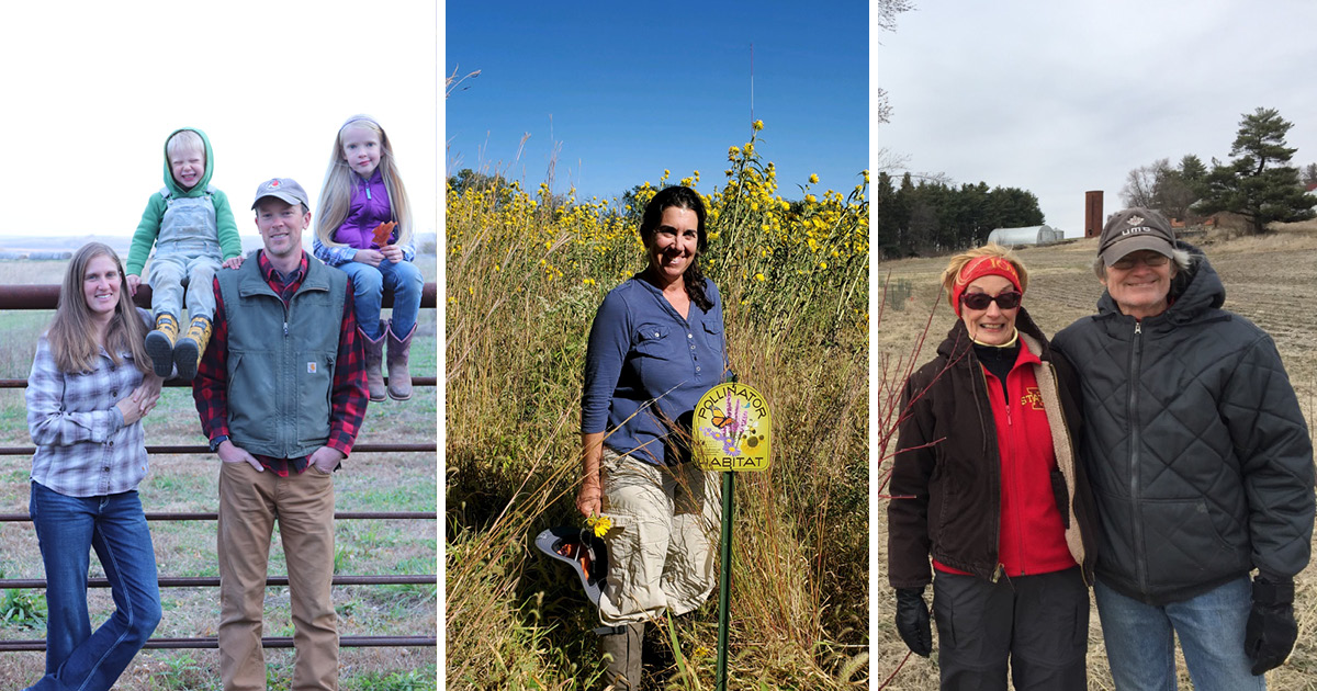 Four private land stewards who participated in a panel with Xerces and the Tallgrass Prairie Center, pictured left to right: Dave Schmidt and family of Troublesome Creek Cattle Company; Ruth Rabinowitz of Oxbow Farms next to a pollinator planting; and Maggie McQuown and Steve Turman of Resilient Farm standing near a riparian shrub and tree planting. Photos courtesy of the panelists.