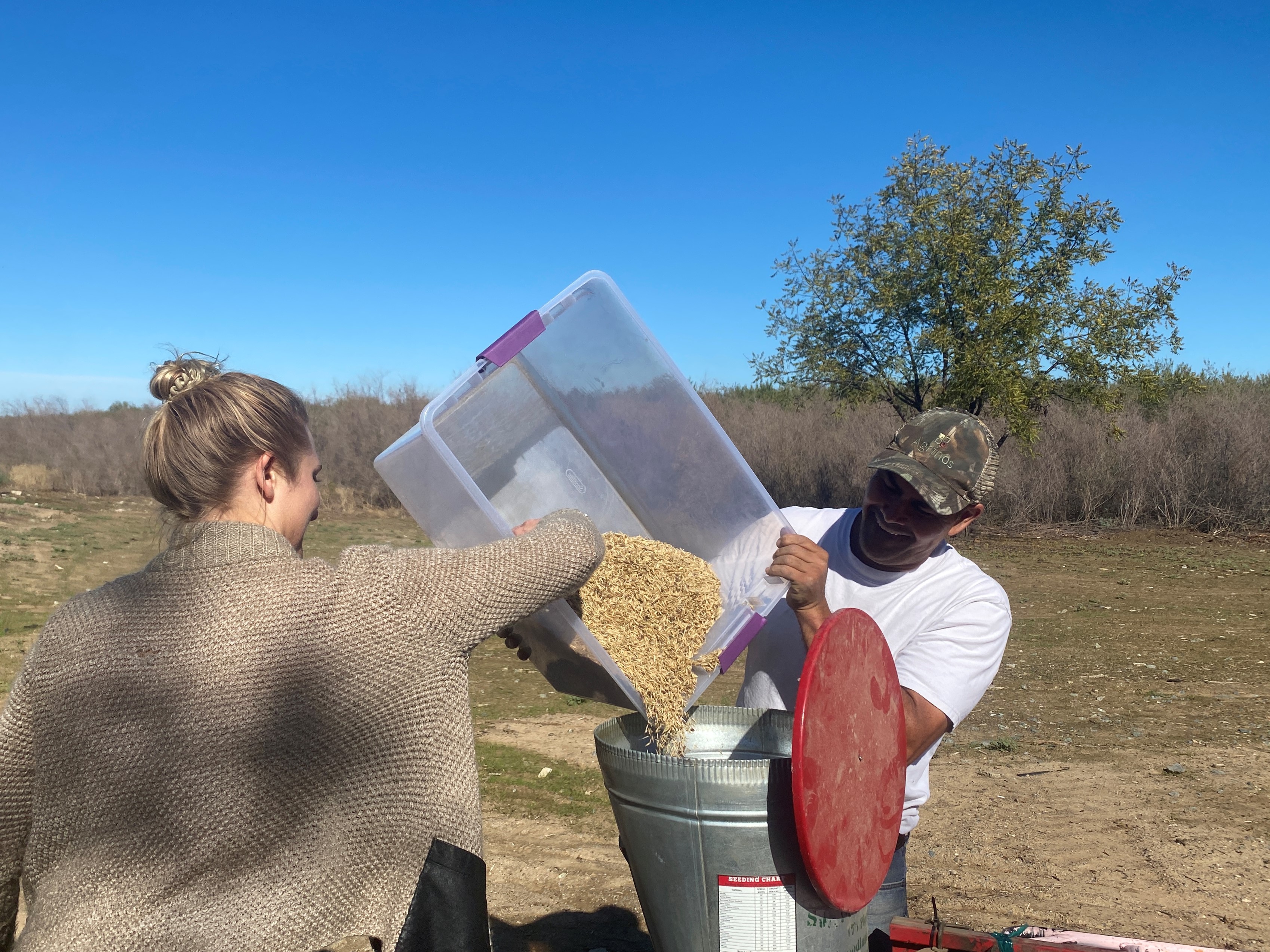 Reclamation seed mixing in Woodland, CA with the General Mills Pollinator Initiative, October 2021. Photo credit: Anna Murray, Xerces Society.