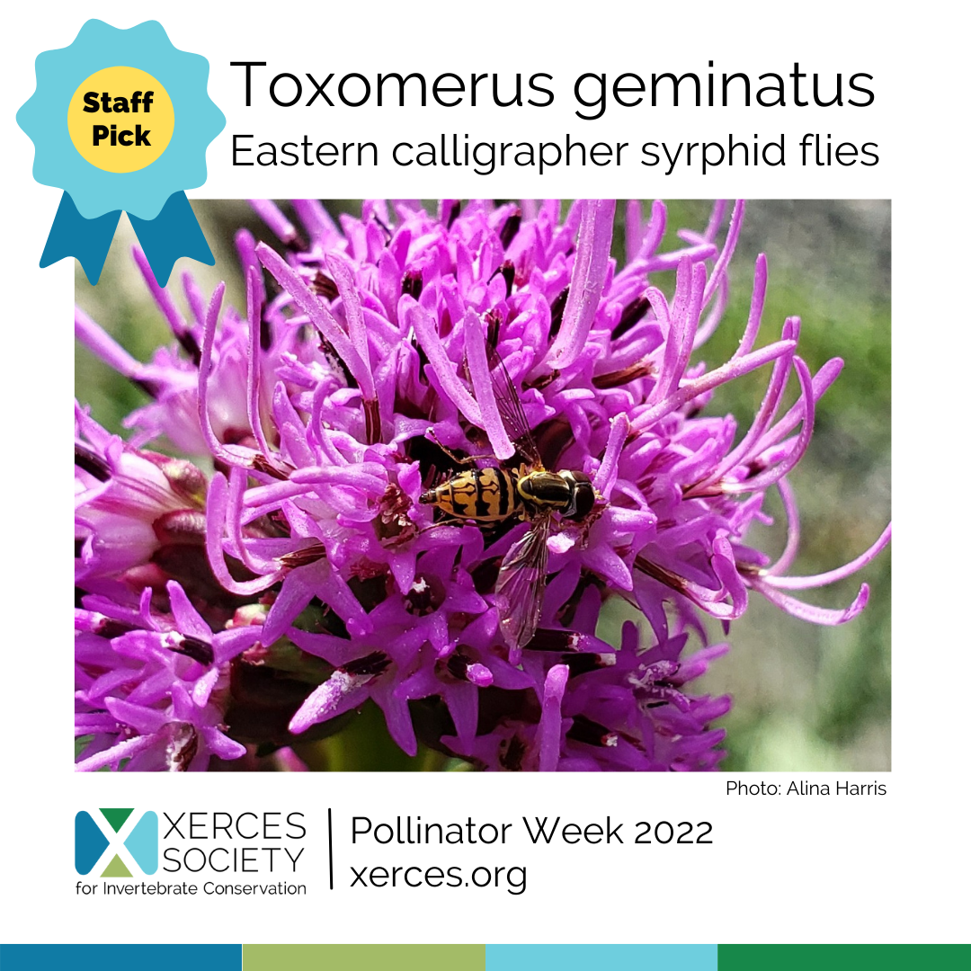 “Aphid-eating syrphid flies are my garden allies! Last year I observed plump Toxomerus geminatus adults foraging from the native flower called Dense Blazing Star (Liatris spicata) and later, their offspring eating the aphids that were attacking my cabbage plants. They're also known to eat mites. I love the ecosystem services that syrphid flies provide in natural and agricultural systems, all the while being so ornate and pretty!”