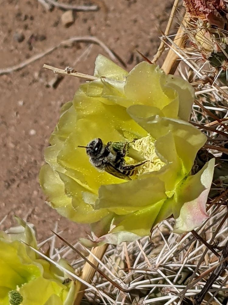 Photo: Emily Ruth Spindler. Cactus specialist bee on cactus flower. Almost half of the 1000 bee species in New Mexico are specialists, meaning that they only eat the pollen of a small group of plants.