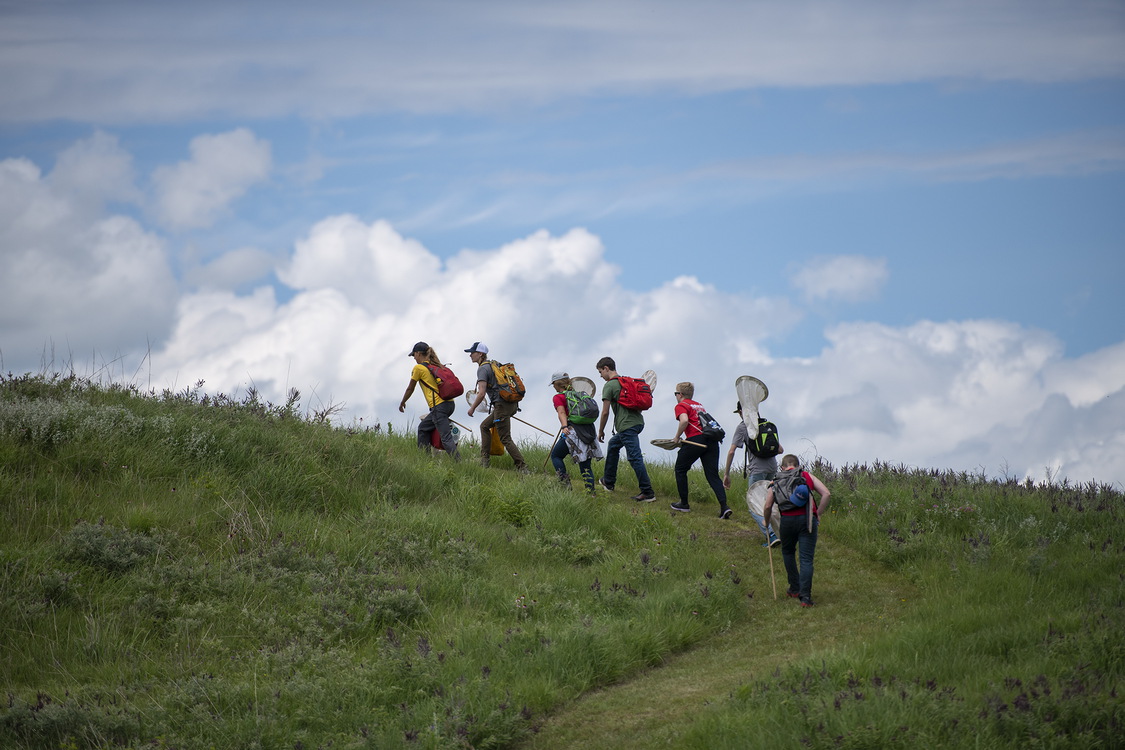 Young Nebraska Ecologists group climbs a hill in Gjerloff Prairie for Bumble Bee Atlas Surveys (c. Britton Bailey)