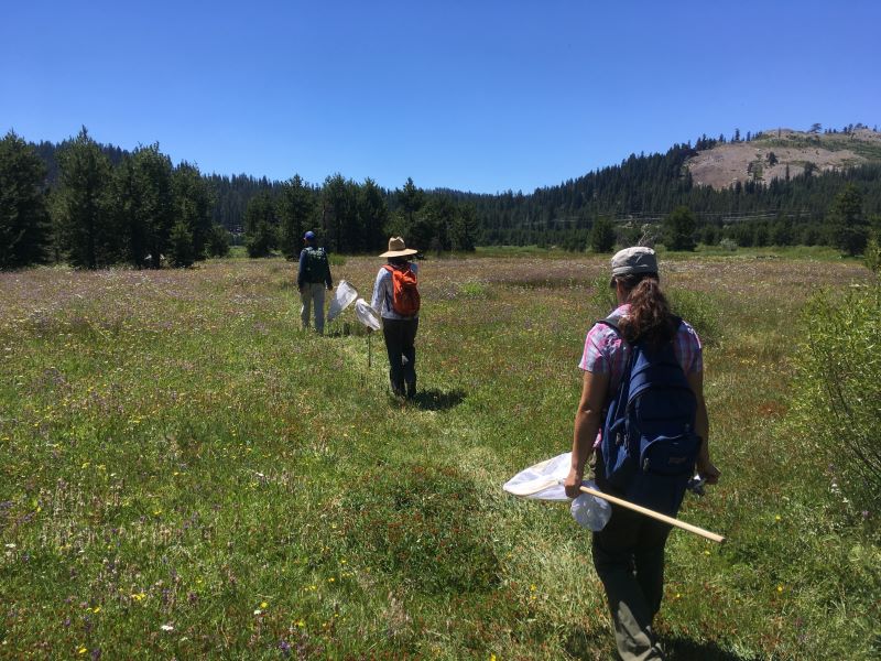 Xerces provides critical monitoring and research for endangered species. Here, Xerces staff cross a meadow on their way to conduct butterfly surveys (Photo: Kitty Bolte/ Xerces Society).