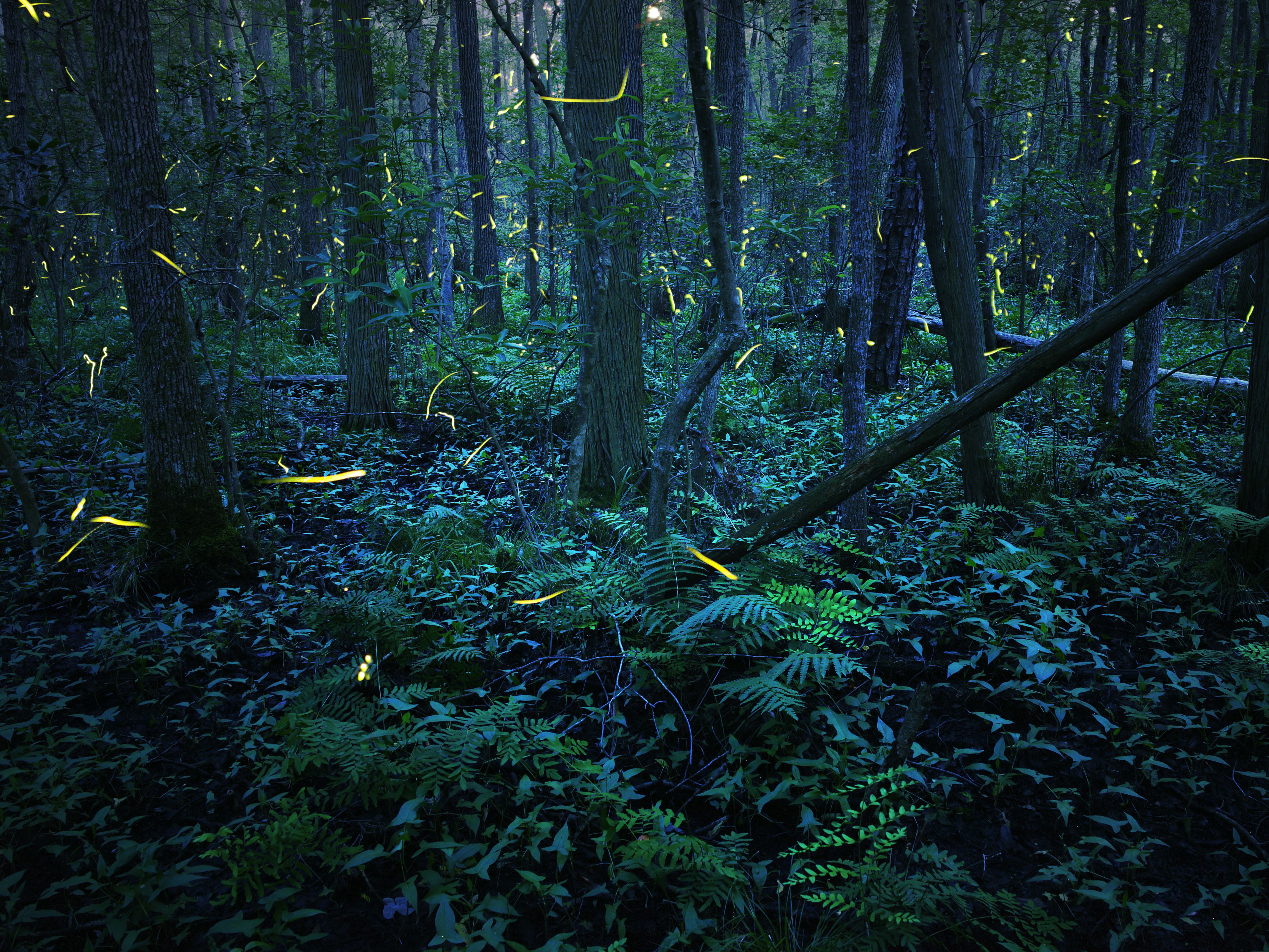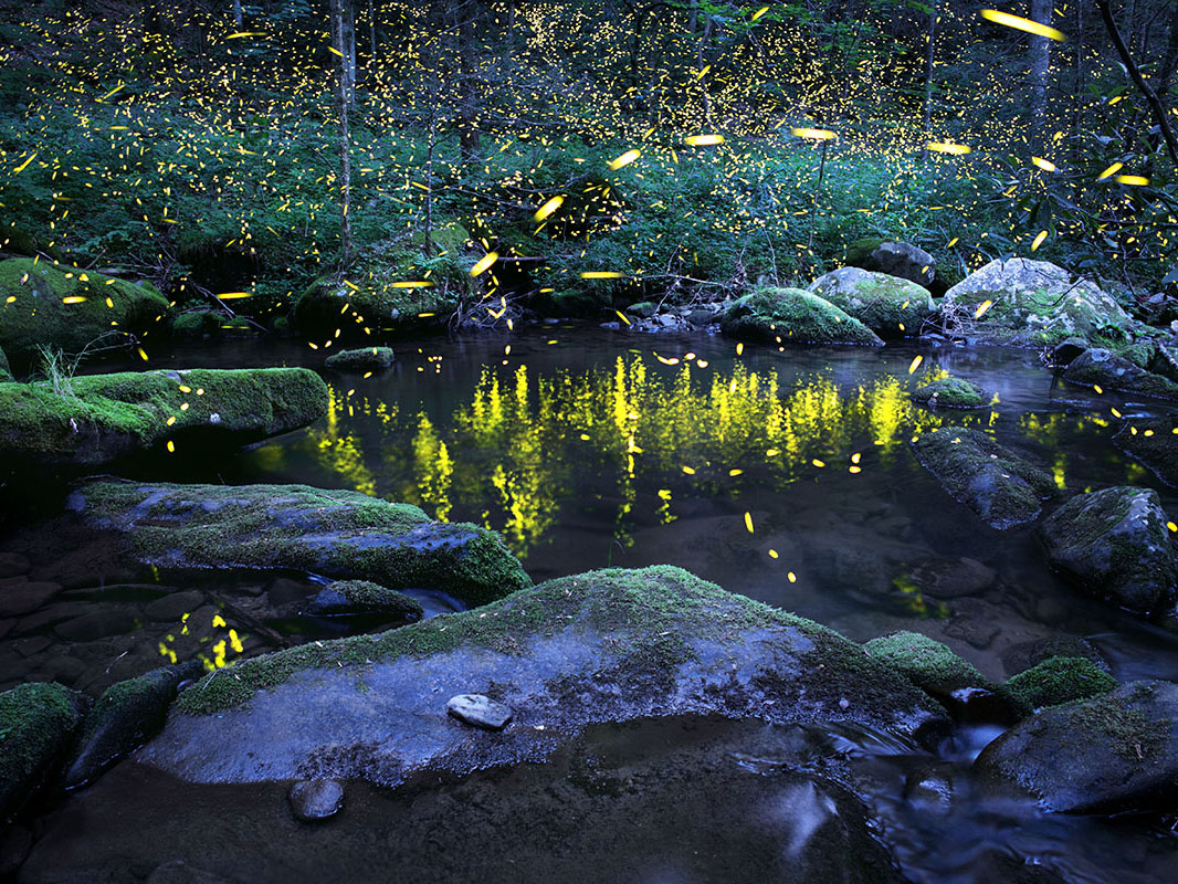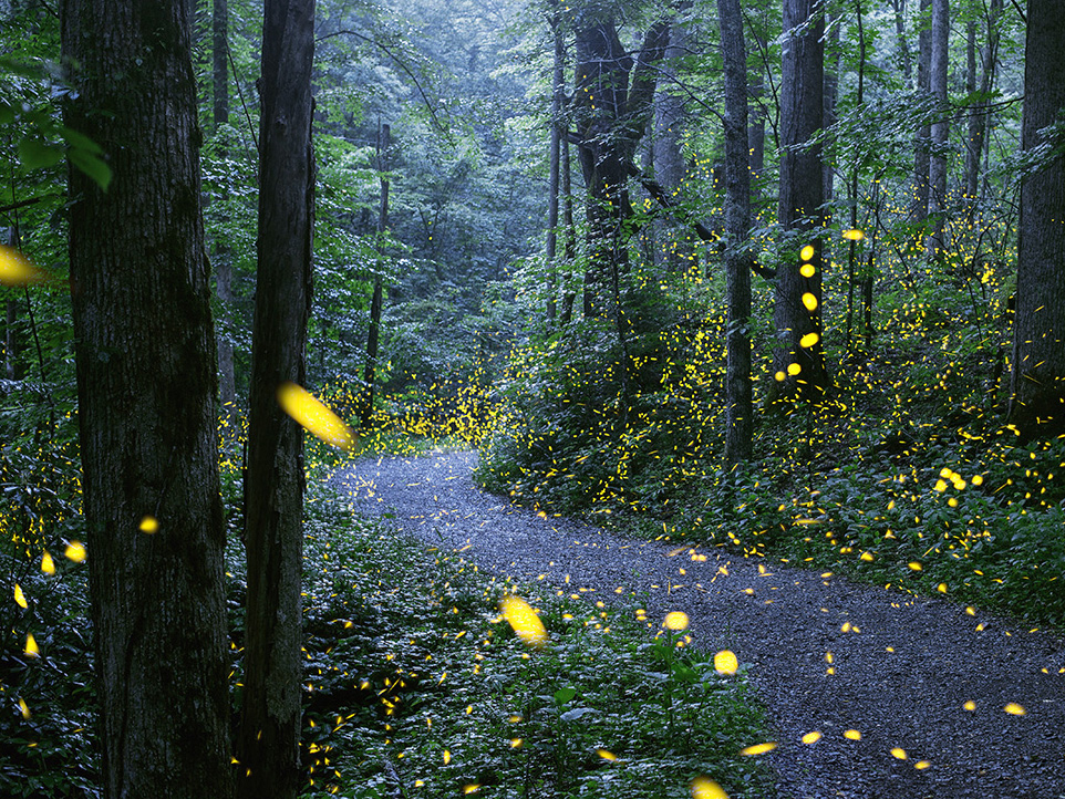 Synchronous fireflies, Photinus carolinus, in North Carolina’s Great Smoky Mountains National Park. Fireflies can be exposed to pesticides in a variety of ways—via direct applications to their habitat, runoff from agricultural or ornamental applications, or consumption of contaminated prey. Their reliance on moist habitats means they are vulnerable to pesticides moving through water.