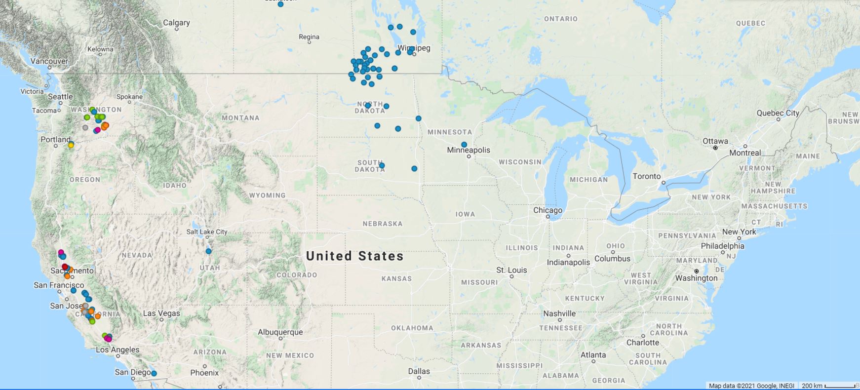We work within the largest-scale farms in North America, partnering with major brands to incorporate pollinator conservation into their supply chains. As is illustrated in the map above, many of our current projects are focused in the agriculturally dense regions of the west coast and the northern plains stretching into Canada, while also supporting farm projects in Mexico, South America, and beyond. Pollinator conservation can be integrated into any cropping system, from row crops to large scale orchards, meeting the needs of farm-specific operation and matching the ecology of the region.