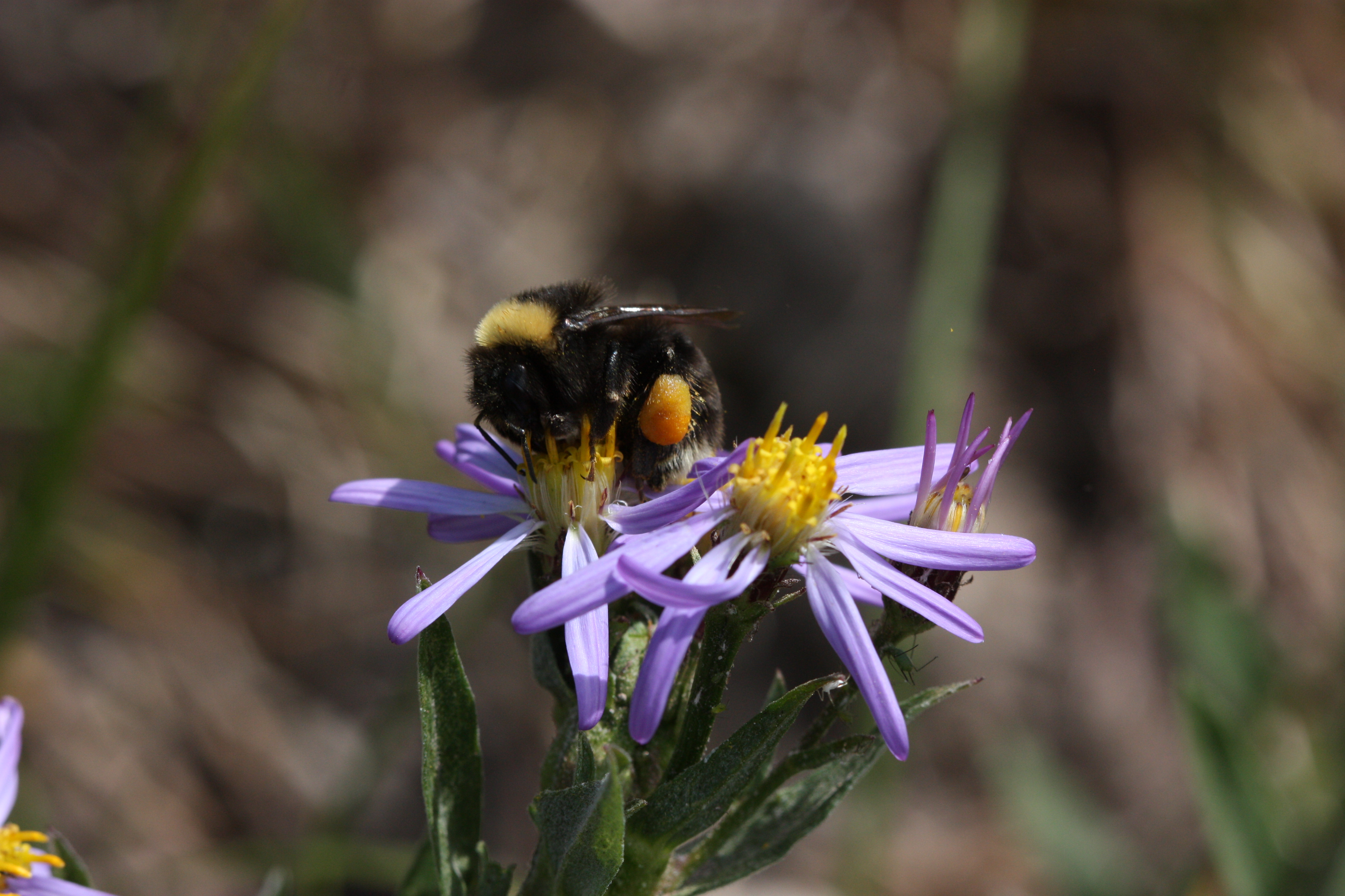 Description: A western bumble bee (Bombus occidentalis) forages on an aster flower. Prior to 1998, the western bumble bee was both common and widespread throughout the western United States and western Canada, but populations have since declined sharply.