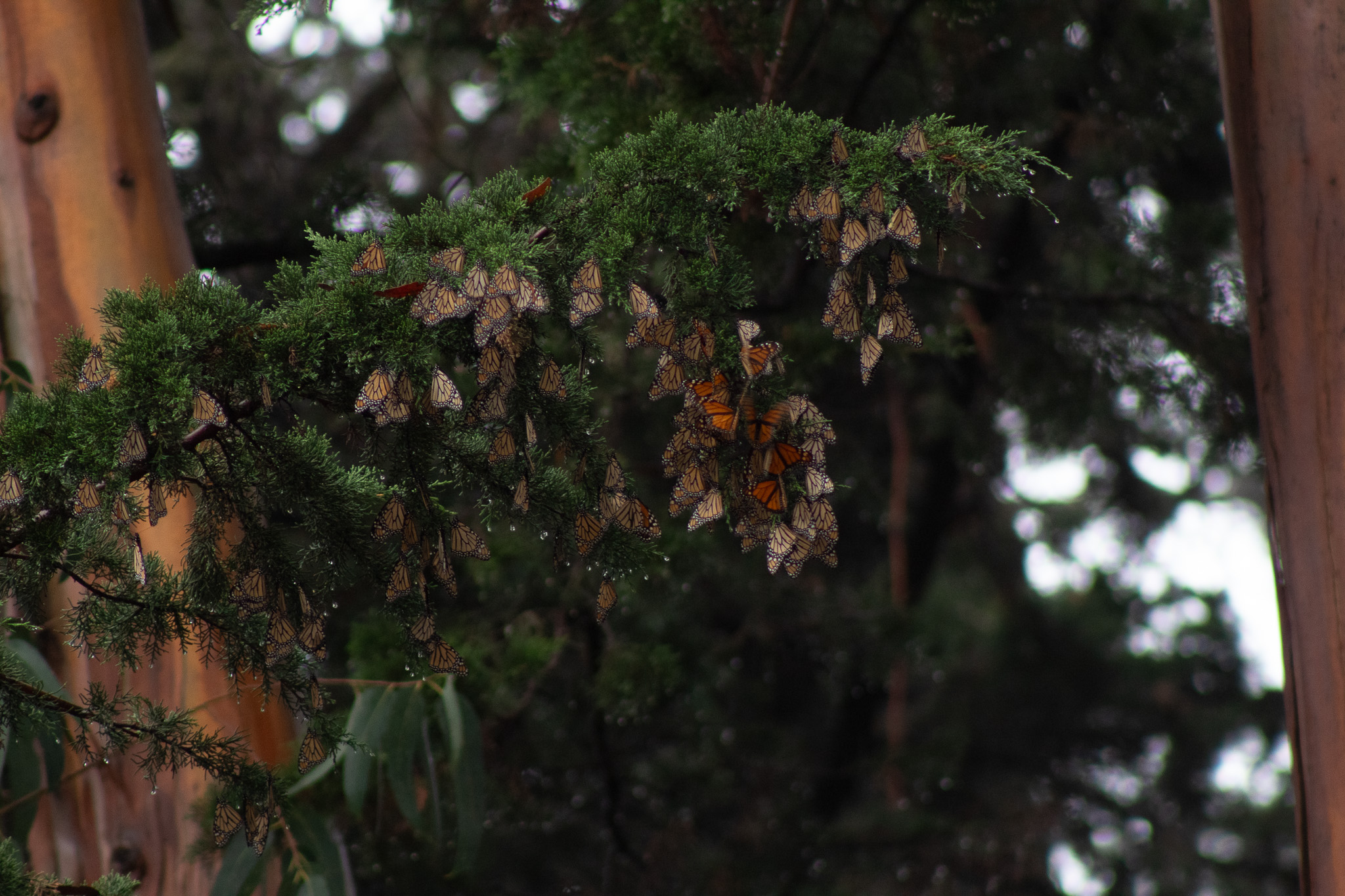 Description: Monarchs clustering on a Monterey cypress after a light rain at Lighthouse Field State Beach in Santa Cruz County, November 2023.