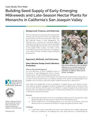 This case study presents a summary of a three-year project to increase the commercial supply of native plant materials for western monarchs, specifically early-emerging milkweeds and late-season nectar plants of San Joaquin Valley ecotypes. The tech note outlines the main activities, methods, and outcomes. The project was a collaboration between the Xerces Society, Great Valley Seed, and California Bureau of Land Management.