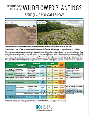 This fact sheet provides a quick overview of the estimated costs of establishing wildflower habitat for pollinators on conventional farms. These cost-estimates are appropriate for any scale project on conventional farms or areas without restrictions on general herbicide use. This method works best for areas with low weed pressure, and timing of treatments is critical for successful wildflower establishment. This estimate represents average cost ranges and are derived from a series of pollinator habitat projects across the United States that involved establishing conservation cover from seed. Specific costs will vary by project and by region.