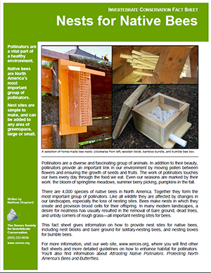 There are more than 3,600 species of native bees in North America. Together they form the most important group of pollinators. This fact sheet gives information on how to provide nest sites for native bees, including nesting blocks and bare ground for solitary-nesting bees, and nesting boxes for bumble bees.
