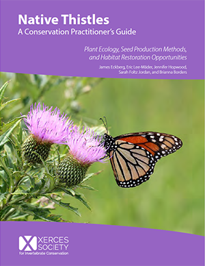 Responding to rising awareness of the value of native thistles to pollinators and other wildlife, the Xerces Society developed a new guide Native Thistles: A Conservation Practitioner’s Guide. In it you will find one of the most comprehensive discussions of the importance of native thistles for pollinators and other wildlife, as well as a detailed account of the conservation status of native thistles. There is a practical section on the production of native thistle seed for use in restoration projects. This section is based on multiple years of actual native thistle seed production by the Xerces Society Pollinator Conservation Program in partnership with native seed companies.