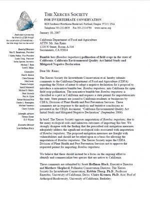 The Xerces Society for Invertebrate Conservation et al. hereby submits comments to the California Department of Food and Agriculture (CDFA) regarding the Notice of intent to adopt a negative declaration for a proposal to introduce a non-native bumble bee, Bombus impatiens, into California for open field crop pollination. The non-native bumble bee Bombus impatiens is classified as a pest in California and requires a state permit for importation into the state. State permits are issued to California residents or businesses by CDFA; Division of Plant Health and Pest Prevention Services. These comments are in response to the analysis and tentative conclusions as presented in the CEQA document, “California Environmental Quality Act Initial Study and Mitigated Negative Declaration” (September 2006).