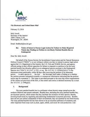 On behalf of the Xerces Society for Invertebrate Conservation and the Natural Resources Defense Council ("NRDC"), we are writing to inform you that we intend to pursue legal action against the U.S. Department of the Interior, the U.S. Fish and Wildlife Service, and agency officials acting in their official capacities for failure to respond to a petition to list the rusty patched bumble bee (Bombus affinis) as an endangered species pursuant to the Endangered Species Act ("ESA"), 16 U.S.C. § 153 1, et seq. See 16 U.S.C. § 1533(b)(3)(A) ("To the maximum extent practicable, within 90 days after receiving the petition of an interested person ... to add a species to ... the lists ... the Secretary shall make a finding as to whether the petition presents substantial scientific or commercial information indicating that the petition action may be warranted."). This letter is provided pursuant to the sixty-day notice requirements of the citizen suit provision of the ESA, to the extent such notice is deemed necessary by a court.