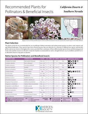 The plants in this list are recommended for use in pollinator habitat restoration and enhancement projects in urban, rural, natural, and agricultural landscapes in the California Deserts and Southern Nevada. These species have been selected because they are attractive to a diversity of different bee species, and provide pollen and nectar resources throughout the season, provided that a minimum of three different plant species from each blooming period (early, mid, and late season) are selected. A majority of plants recommended are native, drought tolerant, easy to establish, and don’t serve as alternate hosts to crop pests or diseases.