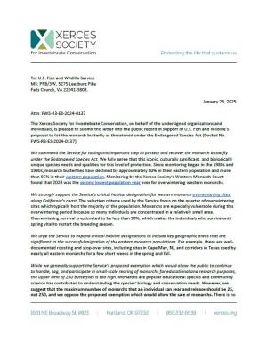 The Xerces Society for Invertebrate Conservation intends to submit this letter into the public record in support of U.S. Fish and Wildlife’s proposal to list the monarch butterfly as threatened under the Endangered Species Act (Docket No. FWS-R3-ES-2024-0137).