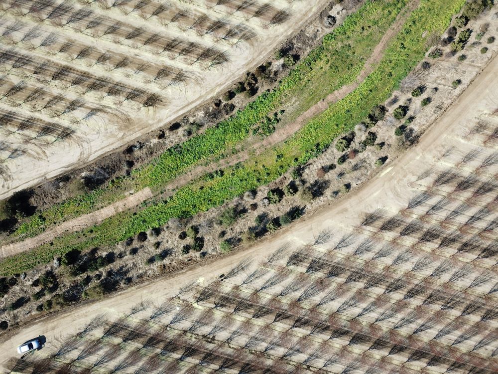 Our work, such as this habitat complex squeezed between two large blocks of almond orchards, is being implemented in some of the most intensively-farmed landscapes on earth. (Image: Cameron Newell, The Xerces Society.)
