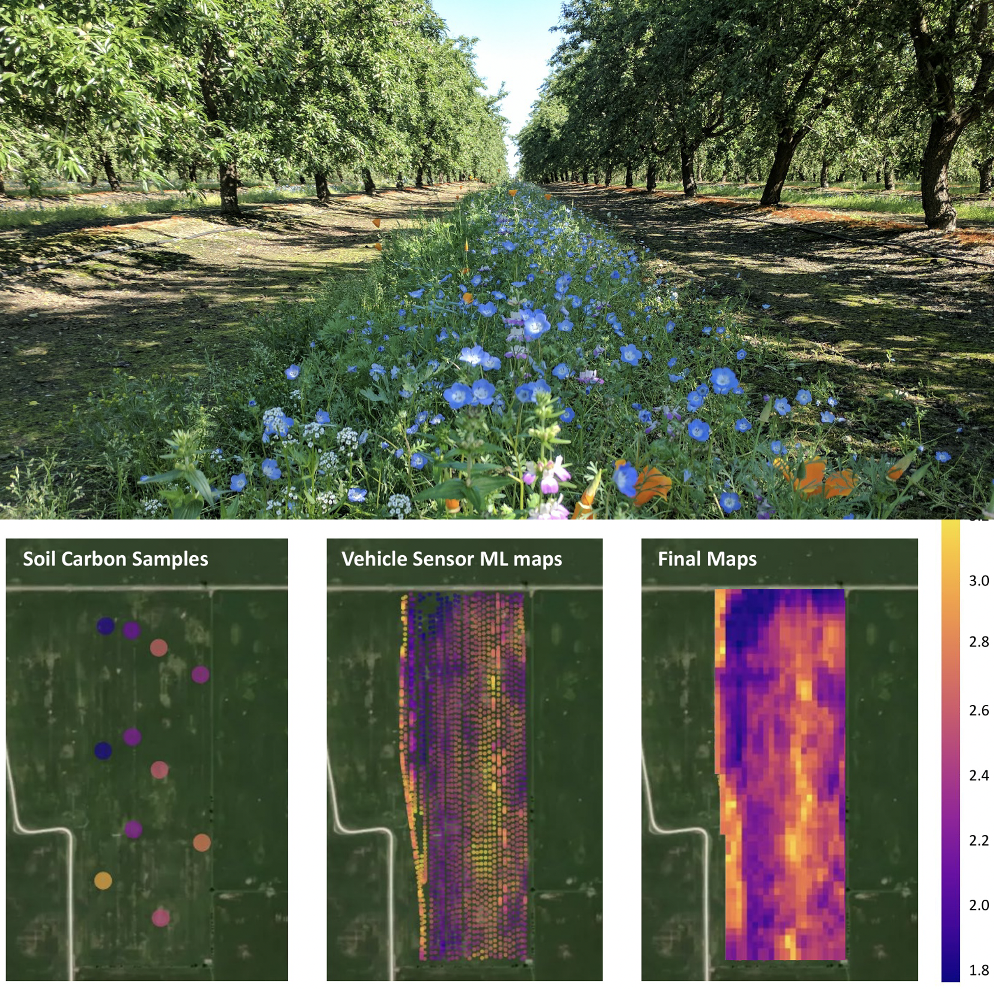 To better understand how practices such as cover cropping increase soil health and soil carbon sequestration, we are launching a new effort to deploy soil mapping technologies across many of our projects. (Image: Earth Optics, and The Xerces Society.)