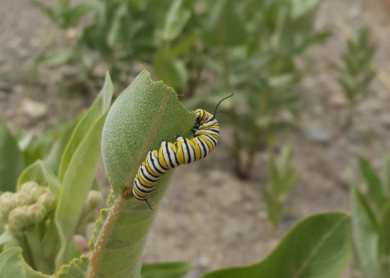 Caterpillars of dwindling butterfly species, such as this monarch caterpillar, are vulnerable to injury or death if they consume plant tissue contaminated with insecticides. Systemics are often found in greater concentrations in leaf tissue than in pollen or nectar. Some newer systemic insecticides, such as chlorantraniliprole, are promoted as bee-safe but are actually very toxic to monarch caterpillars. Photo: Xerces Society /Stephanie McKnight.