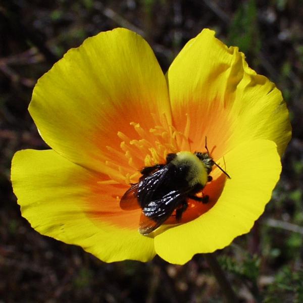 A western bumble bee (Bombus occidentalis) hangs upside down as it collects nectar from a yellow blossom.