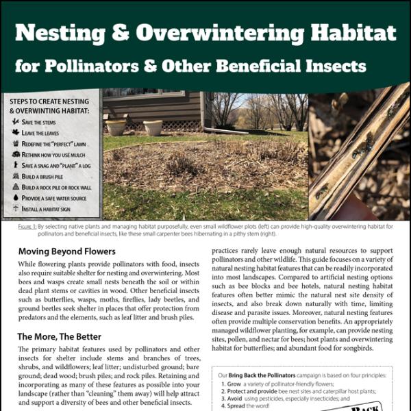 Successful pollinator habitat provides resources for the entire life-cycle. While pollen and nectar sources support adult bees and butterflies, you need to also provide adequate nesting habitat if you want pollinators to live in your landscape rather than just pass through. There are many ways to provide nesting resources through natural and man-made features or simply by changing land management practices. Below is an overview of the nesting needs of bees and butterflies.