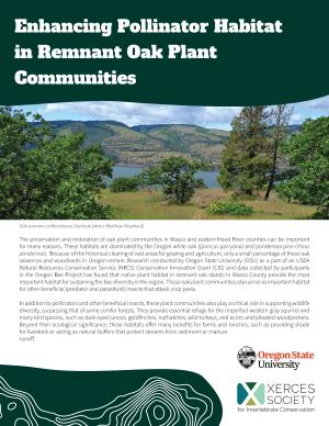 The preservation and restoration of oak plant communities in Wasco and eastern Hood River counties can be important for many reasons. These habitats are dominated by the Oregon white oak and ponderosa pine. Because of the historical clearing of vast areas for grazing and agriculture, only a small percentage of these oak savannas and woodlands in Oregon remain. Research conducted by Oregon State University as a part of an USDA Natural Resources Conservation Service Conservation Innovation Grant and data collected by participants in the Oregon Bee Project has found that native plant habitat in remnant oak stands in Wasco County provide the most important habitat for sustaining the bee diversity in the region. These oak plant communities also serve as important habitat for other beneficial (predator and parasitoid) insects that attack crop pests.