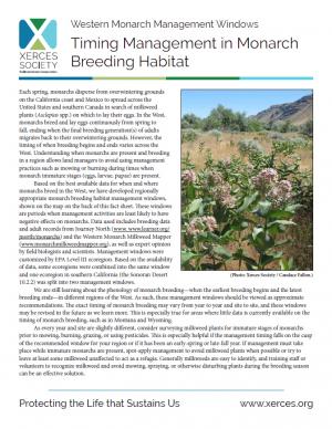 Based on the best available data for when and where monarchs breed in the West, we have developed regionally appropriate monarch breeding habitat management windows, when management activities are least likely to have negative effects on monarchs.