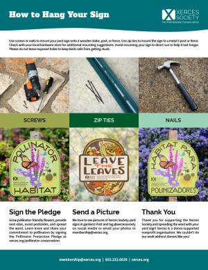 An instructional insert explaining how to hang a Xerces Society yard sign from the gift center using screws, zip ties, or nails.