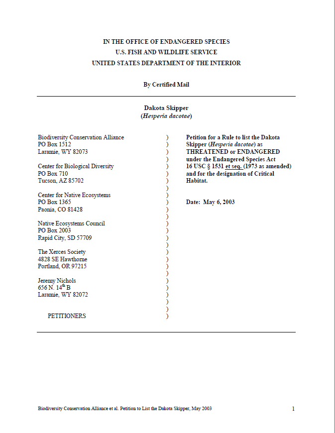 Petition for a Rule to list the Dakota Skipper (Hesperia dacotae) as threatened or endangered under the Endangered Species Act 16 USC 1531 et seq. (1973 as amended) and for the designation of Critical Habitat